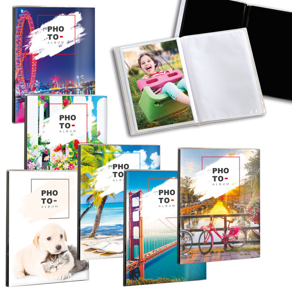 Album portafoto a busta saldati sul dorso. Confezioni con copertine assortite con buste bianche e nere. 24 foto da 10x15cm. Formato 12,5 x 16,5cm. - LEBEZ Conf. da 1 Pz. S/N: 8007509027455